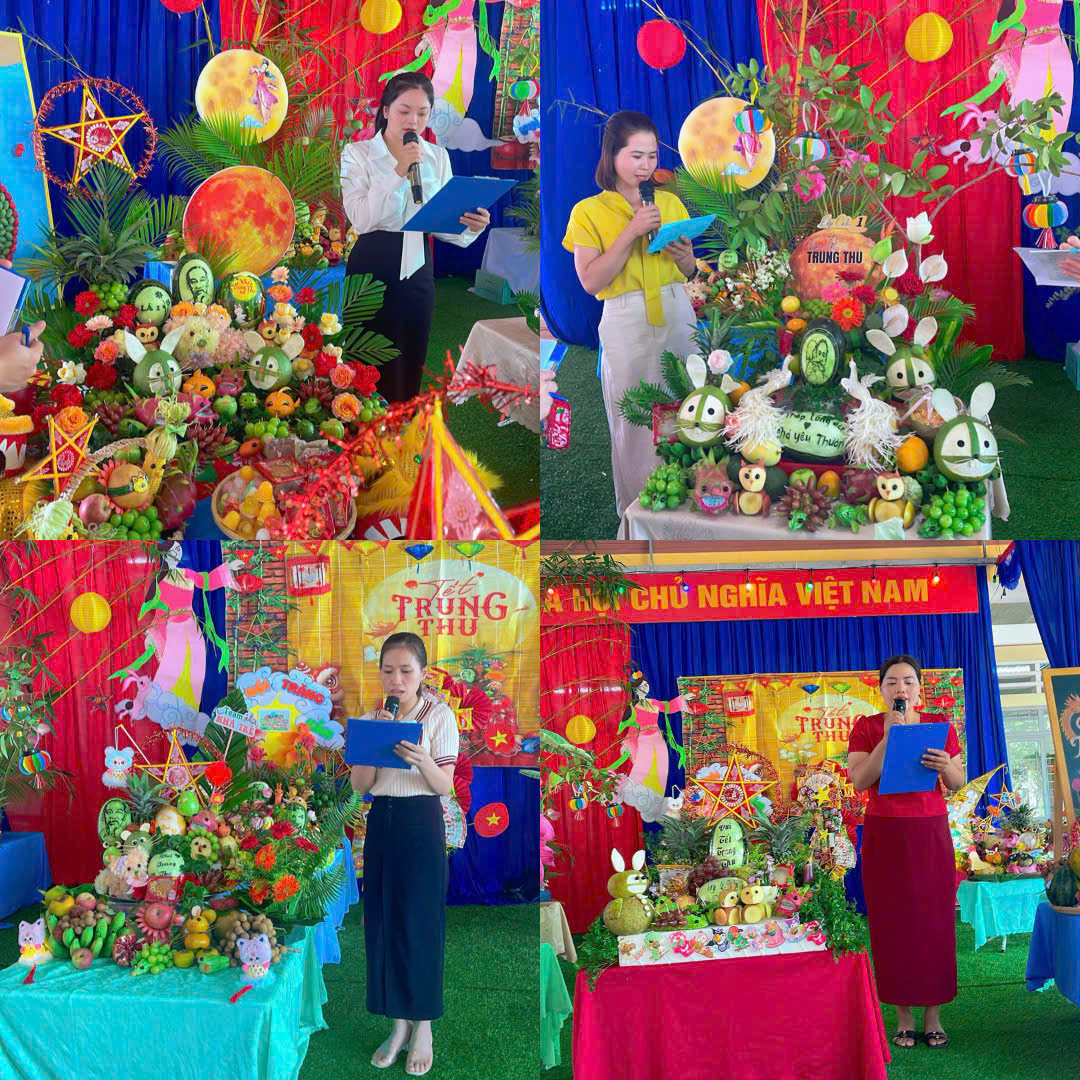 Buổi sáng, nhà trường tổ chức Hội thi Mâm cỗ Trung thu với sự tham gia của 11 lớp. Mỗi lớp là một sắc màu riêng, thể hiện sự sáng tạo, khéo léo và tâm huyết của phụ huynh cùng các cô giáo. Các mâm cỗ được chuẩn bị chu đáo, đẹp mắt, đảm bảo an toàn vệ sinh thực phẩm và mang đậm ý nghĩa truyền thống. Các lớp đã cùng nhau thuyết trình về ý nghĩa mâm cỗ Trung thu của lớp mình, thể hiện sự hiểu biết và niềm tự hào về nét đẹp văn hóa dân tộc. Ban giám khảo làm việc công tâm dựa trên các tiêu chí: hình thức trình bày, tính sáng tạo, ý nghĩa chủ đề và an toàn vệ sinh. Không khí hội thi diễn ra sôi nổi, vui tươi, gắn kết tình cảm giữa Phụ huynh – Cô giáo – Các bé.